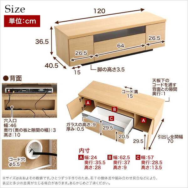 ■サイズ:外寸:(約)幅120x奥行き40.5x高さ36.5cm※商品重量:(約)27kg■カラー:ダークブラウン ナチュラル ホワイト■素材:ホワイト:ポリエステル化粧合板(鏡面)ナチュラル、ダークブラウン:プリント化粧合板共通:強化ガラス■その他:・完成品でのお届けです。