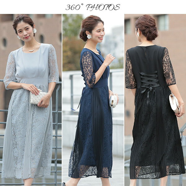 パーティードレス 結婚式 ドレス ワンピース 袖あり 大きいサイズ 小さいサイズ レース ロング ミモレ丈 パーティドレス 結婚式ドレス お呼ばれドレス フォーマル 5分袖 レース切り替え プリーツ パーティードレス【DSA136】